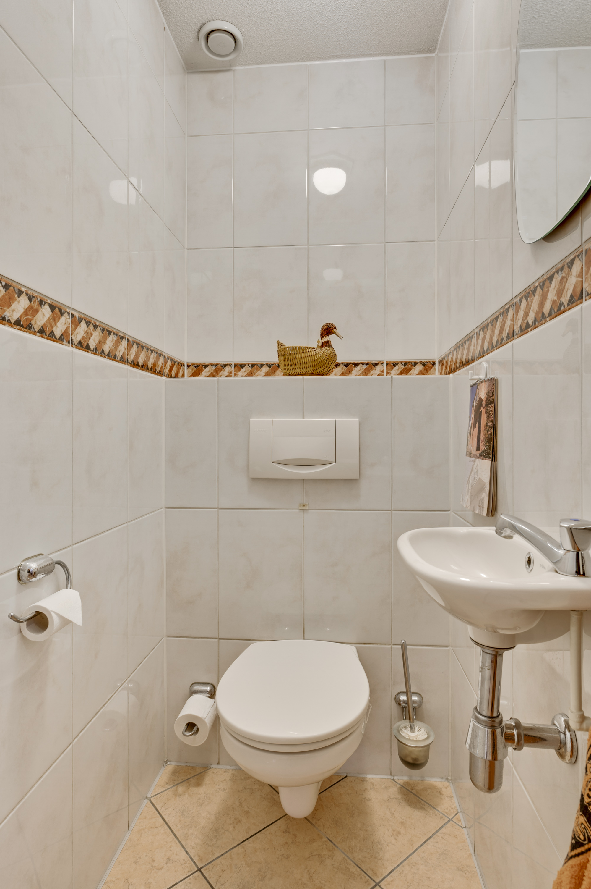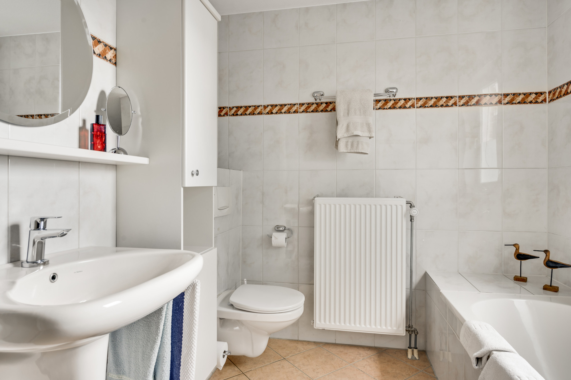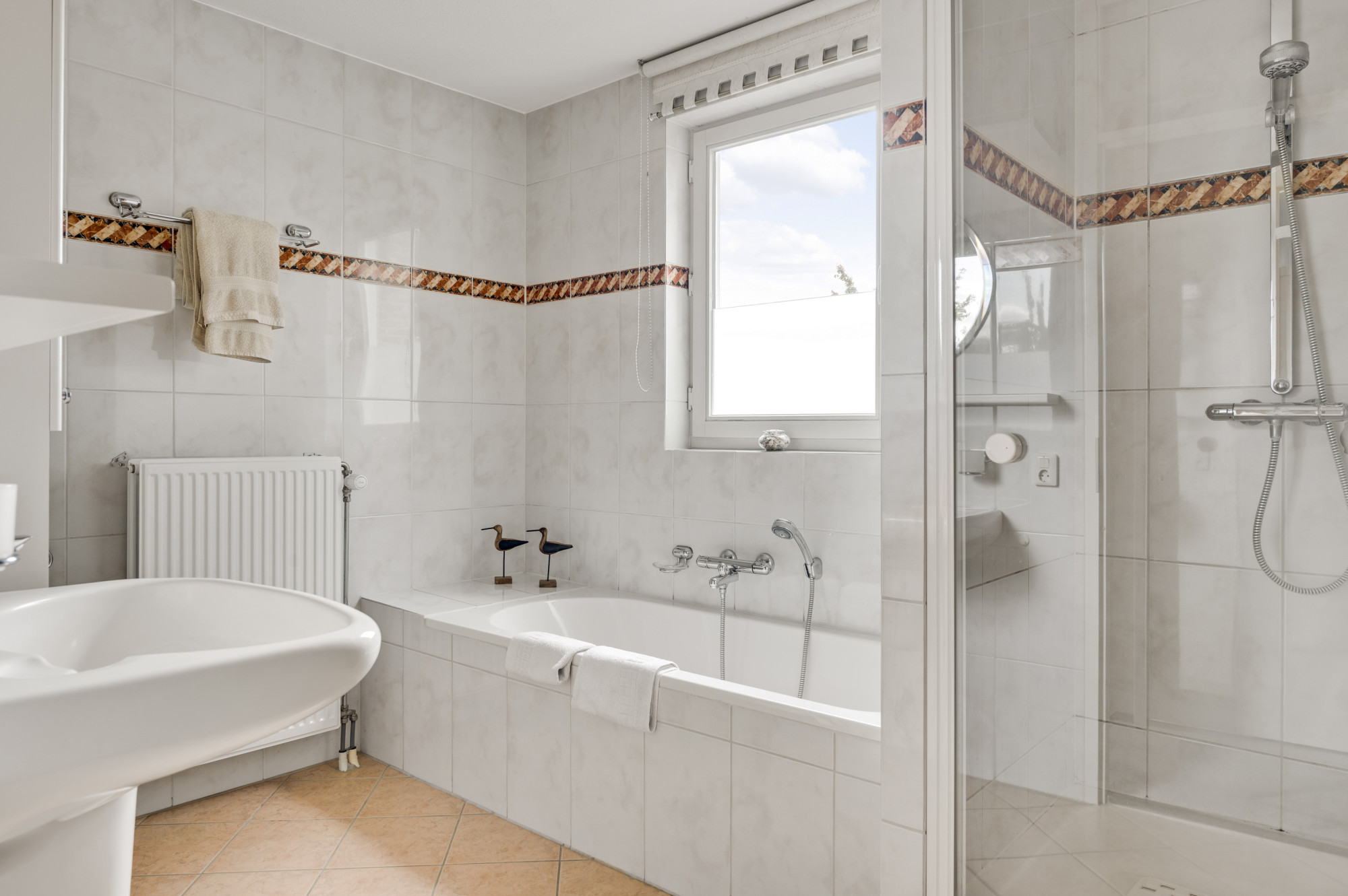De overloop geeft toegang tot drie slaapkamers, de badkamer en een aparte cv-ruimte met de opstelling van de cv combi ketel (Remeha HR, eigendom, ca. 2015). De complete badkamer is voorzien van een douche, ligbad, toilet, wastafel en badkamermeubel.