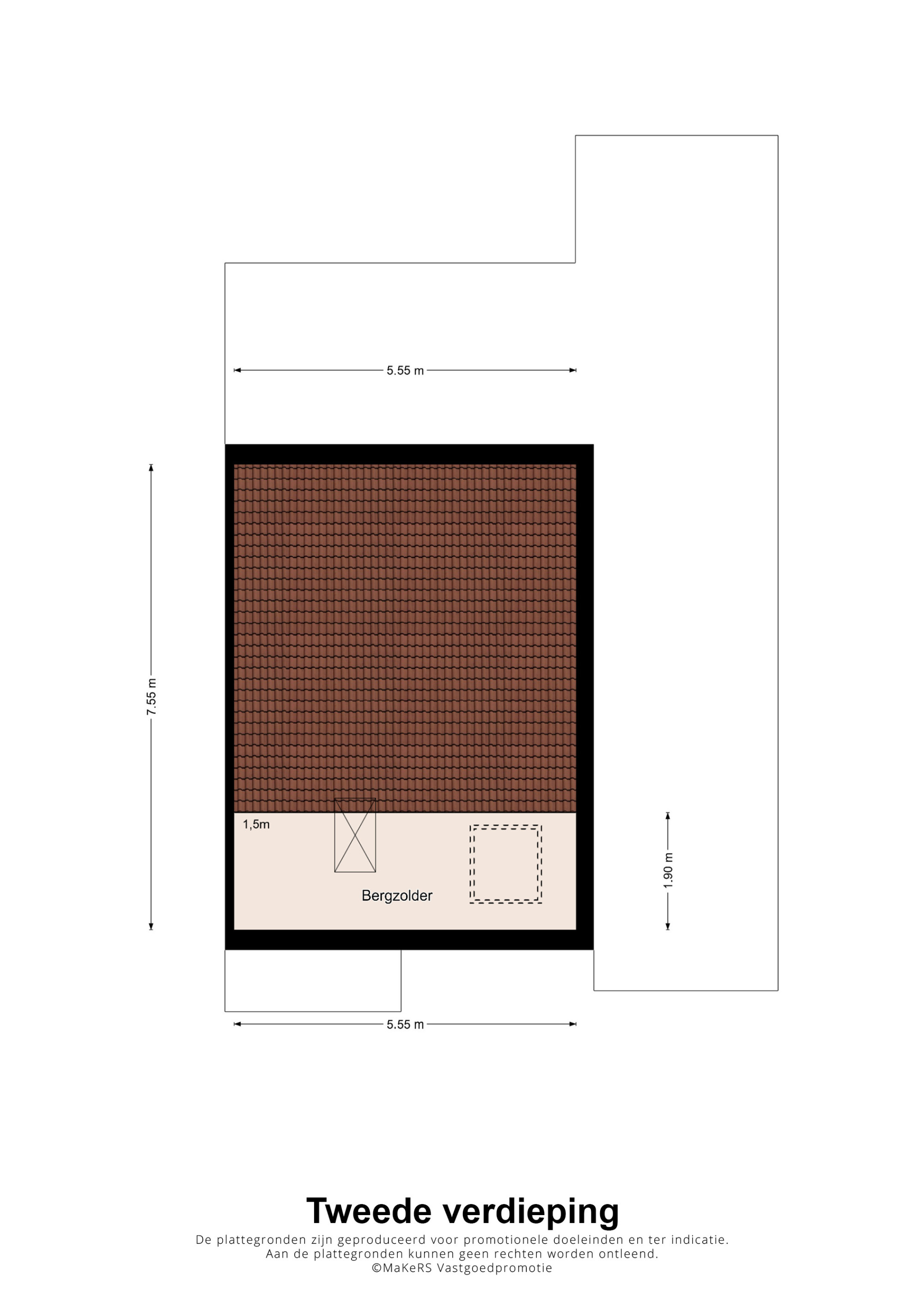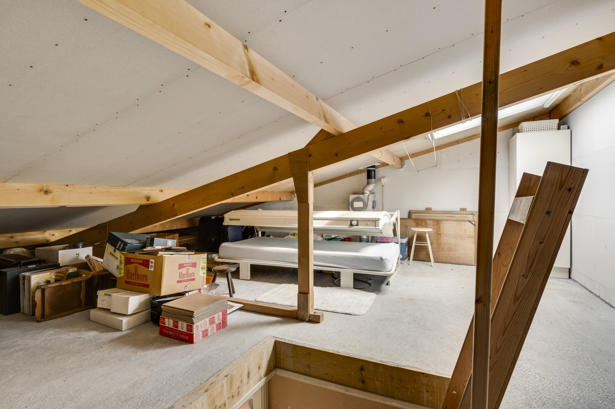 Een grote bergzolder met dakraam, welke te bereiken is via een vlizo trap.