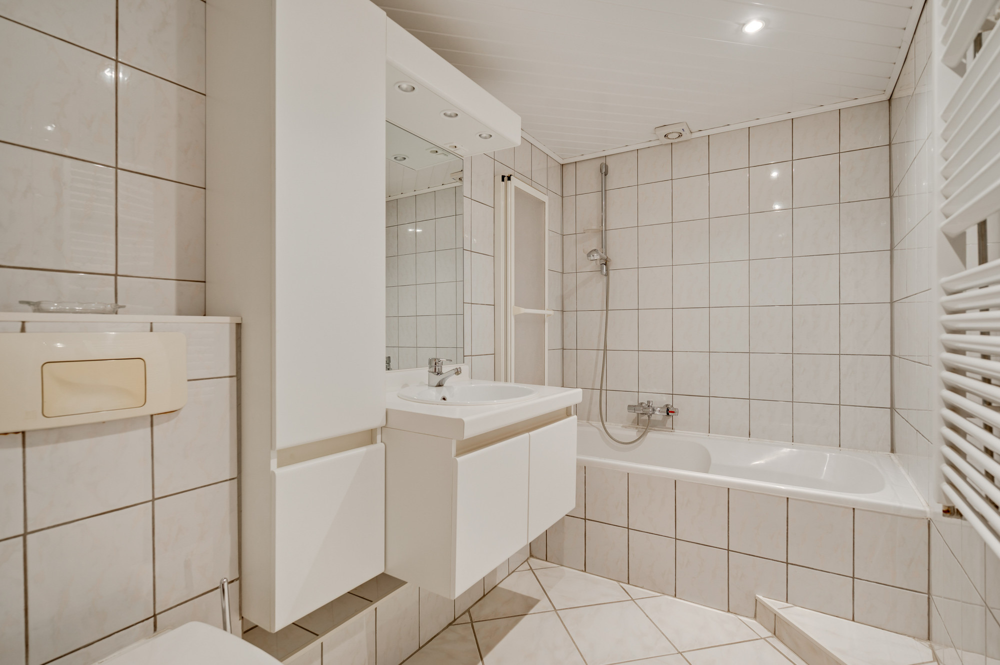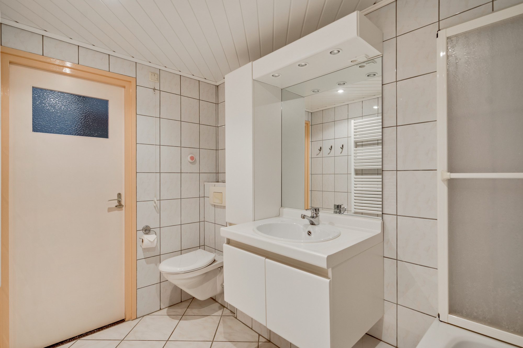 De badkamer is praktisch ingericht en voorzien van mechanische afzuiging, een ligbad met douche, wastafel met meubel en toilet.